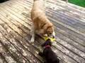 This little chocolate lab has been pestering the Golden Retriever for days... now he gets his revenge! |